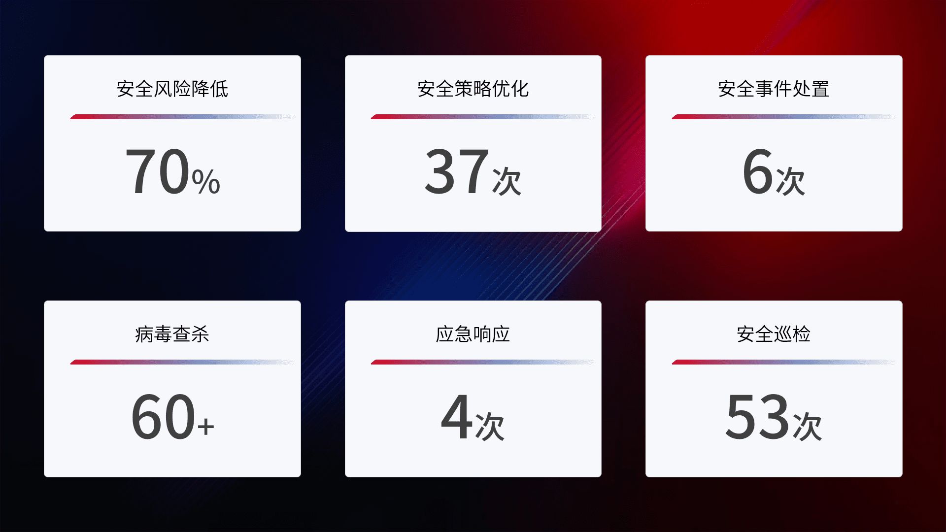 提供全面的安全事件报告体系,,包括处置报告、、周报、、、、季度和年度总结,,,结合持续监控,,,帮助客户深入了解网络安全状况。。。。